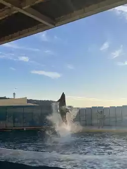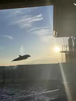 I happened to watch it during the evening show, so I was able to take a nice photo of the dolphins and the sun 📸