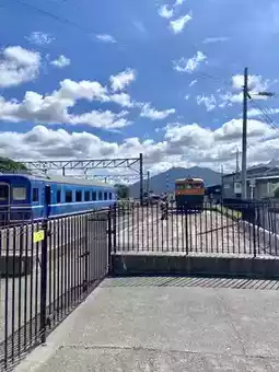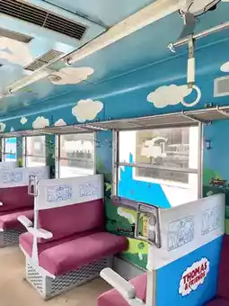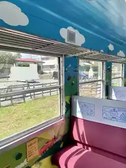 ✨The train is parked behind Shimoyoshida Station, which is a train that is no longer running. So, it stopped so that we could go up and take some cute pictures of the train. It looks so cute, both the colors and patterns on the outside and inside of the train. It's definitely cute and kids will love it.