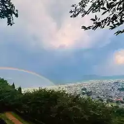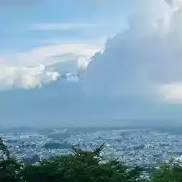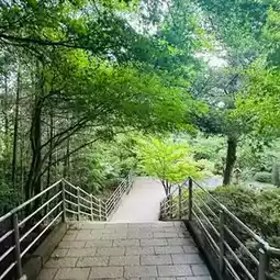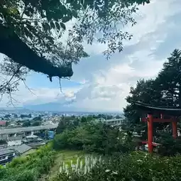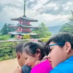 This is the legendary spot where you can see both Mount Fuji and the five-story pagoda. Upon arriving at the famous pagoda viewing platform in Arakurayama Sengen Park, you need to climb stairs from the parking lot all the way up to the viewing platform. At the top of the mountain, you'll find the five-story pagoda, and if you continue further up, there's another viewing platform. On clear days, you can see both the pagoda and Mount Fuji. Unfortunately, when we reached the top, we couldn't see Mount Fuji, but the sky was very bright. The clouds occasionally parted a bit and then covered up again. We kept hoping to catch a glimpse of Mount Fuji through the clouds, but it never happened. Since we weren't in a hurry, we stayed up there for over an hour! In the end, we had to give up.