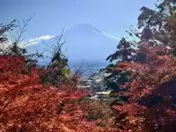 From the viewing platform above, you'll witness a world heritage view that perfectly combines Japan's quintessential elements: the vivid red pagoda in the foreground, surrounded by a forest of maple and other trees turning vibrant shades of red, orange, and yellow, with the snow-capped Mount Fuji towering in the background.