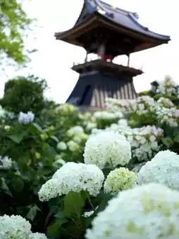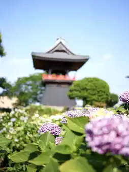 The shot of the temple bell in the bell tower and the hydrangeas is famous.