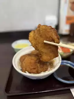 The bowl features crispy, thinly pounded pork loin, dipped in a secret sauce, and placed on top of rice.