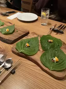 First, the appetizer was a stylish dish made with perilla leaves. It was delicious, with the flavors of chicken, vegetables, and fruit all in one bite. ✨