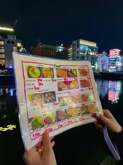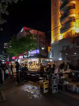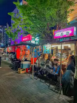 It's a tourist street food, so the price is a bit high, but there are many places with English and Korean menus and the atmosphere is good, so it's good to have a beer/highball before going back to your accommodation.