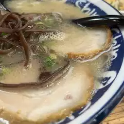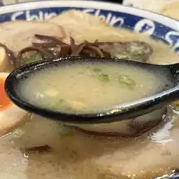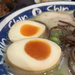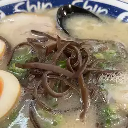 A luxurious bowl topped with all the toppings, including boiled egg, roasted pork, wood ear mushroom, and green onion. The light, mild pork bone soup is topped with very thin noodles that go well with the soup. The tender pork belly roasted pork is also delicious.