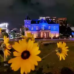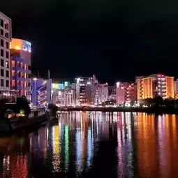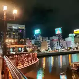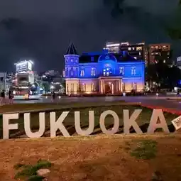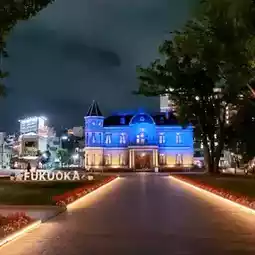 The buildings along the river are decorated with beautiful colored lights. The lighting is arranged to the rhythm of the music, very beautiful. Walk on the Fuku-Haku Deai Bridge across to Tenjin Central Park. There is Kihinkan Hall, an old Western-style building built in the Meiji period, which is a national treasure. At night, the lights are beautifully lit, very striking. Walk around and take beautiful pictures.