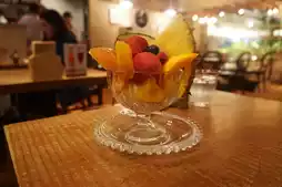 We ordered two cups to share the joy. The mixed fruit cup was our choice, with pineapple, orange, and also strawberries, mango, blueberries, and more, very rich in variety. Japanese fruits are not necessarily sweet, but combined with red sorbet and yogurt ice cream, it's refreshing and delightful. Even if you're full from dinner, you can easily finish the whole cup.