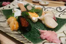 Let's have two plates of sushi to share. The first plate has nine pieces. The ingredients are really fresh enough. The crispy red mussels and the sweet and thick scallops pleased me the most, and the juicy feeling of salmon roe was never better. Who says Japanese people don't eat salmon? This plate also has good quality salmon sushi. And what I dislike the most is always cooked shrimp.
