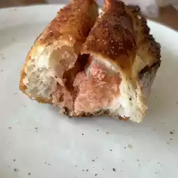 The high-hydration, chewy bread is filled with plenty of mentaiko, which is amazing🥹