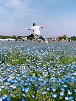 Umi-no-Nakamichi National Park is surrounded by the sea in Higashi-ku, Fukuoka City. 🌊 You can enjoy seasonal flowers, playground equipment, a dog run, and more. When we visited, the nemophila flowers were blooming beautifully, and we jumped in the nemophila fields😍
