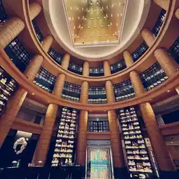 The hotel lobby features high pointed columns and rows of bookshelves, creating an atmosphere reminiscent of an old European library. It feels like stepping into the scene where Belle and the Beast dance in Beauty and the Beast, which is truly stunning and perfect for photos!