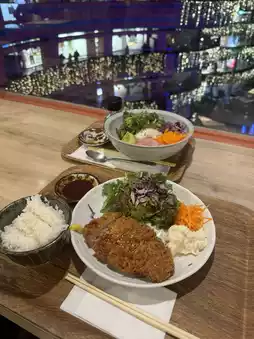 I stuffed my cheeks with a thick pork cutlet while watching the fountain show and illuminations... I'm so happy(◦ˉ ˘ ˉ◦)♡