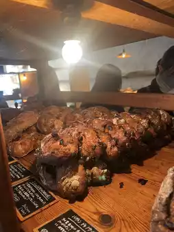 The shop opens promptly at 8 AM, and the staff efficiently ushered everyone inside. Wow! The bakery has an incredible atmosphere, with light bulbs and wooden decor creating a rustic feel. The variety of sweet and savory pastries, combined with the aroma of freshly baked goods, made the place feel so cozy and inviting 😊