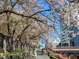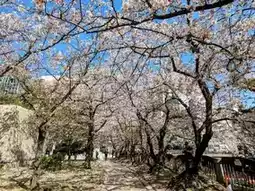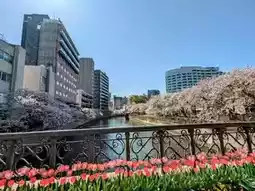 Tenjin Central Park was built along the Yakuin River. About 50 cherry trees are planted on both sides of the river and in the park. When the cherry blossom season comes, the pink-dyed Yoshino cherry blossoms bloom. Looking from the bridge over the river, the cherry blossoms by the river, coupled with the blue sky and white clouds, are like a painting-like beauty.