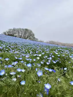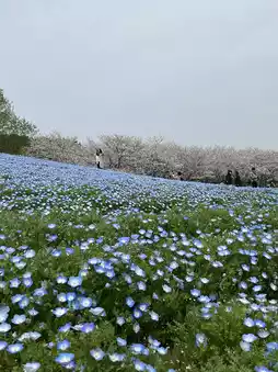 The **pink butterfly flower sea** in Uinaka-do Park is in full bloom. The blue and white flower fields match the spring breeze, and the scenery is pleasant, perfect for walking and taking pictures. However, the flowers are not the brightest, slightly not shocking enough.