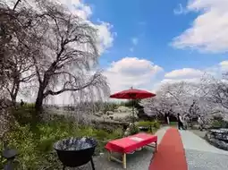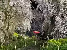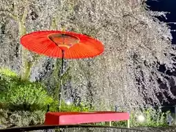 The most famous attraction in Hokkehara Gardens is the 10-meter-tall, 60-year-old Minobu weeping cherry tree, which blooms in mid-March. The cherry blossoms are like a waterfall, and it is a charming sight to admire them under a red umbrella, whether it is day or night.