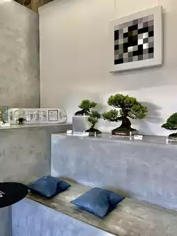 • Minimal yet warm interior: exposed concrete walls, wooden tables, and an open structure with natural light.