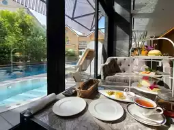 The sweets selection included five items, such as a fresh cream strawberry croissant, a macaron perched atop ice cream, and a seasonal fruit bowl, offering a rich and satisfying variety. The sunlight and shadows reflecting on the pool added to the beauty of the experience.