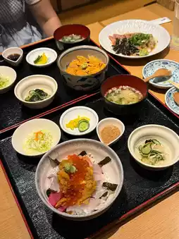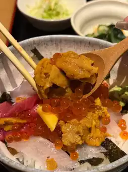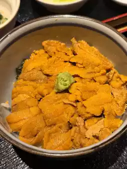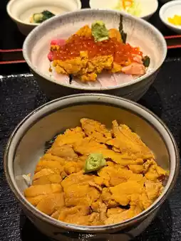 About ten minutes from Akasaka Station, the store is not difficult to find, in an alley, the area is not popular, there is a big shopping mall, open at 5:30 pm, no need to queue up if you go at 5:45 on Wednesdays, the waitress is very enthusiastic, the menu is not in Chinese, the sea urchin donburi is 1950 yen, but the night set meal is 2150 yen, about 105 yuan, and there is no tax!!! I ordered a sea urchin bowl and a seafood bowl, and also ordered the soy sauce live fish sashimi recommended by my sister. I didn't have to order drinks, and it was served with ice water. The bowl was very large, the sea urchin was fresh and not fishy. It was a little bitter when eaten alone, but the soy sauce flavor came out. The price is really good for the price. The seafood bowl has sea urchin, tuna, lionfish, and salmon roe, all of which are very fresh! The soy sauce sashimi was a pleasant surprise. It was very fresh without any seasoning and not fishy. It was served with sesame, green onions, seaweed, mustard, and then sesame paste was added to mix and eat together, which was another flavor! Figure 3 shows all the dishes eaten by two people. The bill was 265 yuan. Overall, it is worth recommending. Good products, good service, and good value for money! #海胆