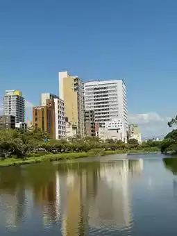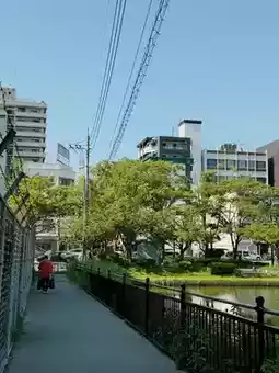 This is Maizuru Park in Fukuoka, a place known for having the most beautiful cherry blossoms in the city. However, even if you visit during other seasons, you can still experience the unique beauty of each season. If you visit now, in summer, you'll be greeted by the intense sunlight reflecting off the buildings and trees in the park, creating a vibrant and striking atmosphere. The high saturation of colors also adds a unique charm to the scenery. If you're planning a trip to Fukuoka, I highly recommend taking a stroll through Maizuru Park!
