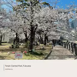 This time, we invited friends to a picnic and enjoy the cherry blossoms at Tenjin Central Park in the heart of Fukuoka. There are about 50 cherry trees lining the Yakuin Shinkawa River. From late March to early April, the trees bloom, creating a tunnel of pink blossoms. If you're lucky, you might even catch a cherry blossom festival and nighttime illuminations, adding another layer of romance.