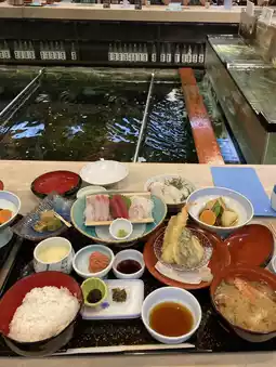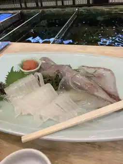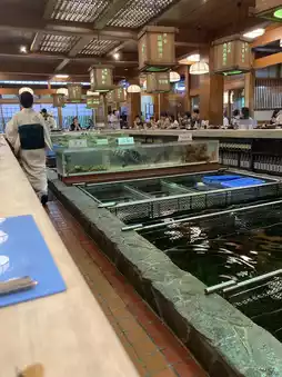 The restaurant's interior is filled with tanks of fresh squid, abalone, and other fish, creating a stunning atmosphere! Fresh sashimi and luxurious set meals are popular, with lunch starting at around ¥2,000.