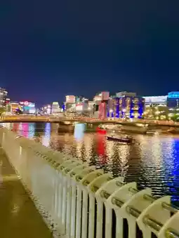 The street lined with food stalls along the riverside, illuminated by twinkling lights and neon signs, was truly breathtaking. π