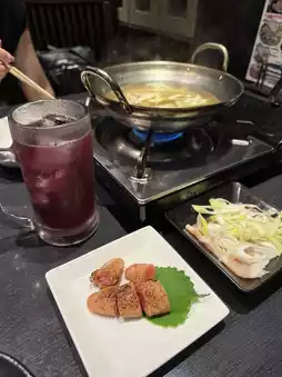 5️⃣ Hakata Motsunabe (Beef Offal Hot Pot): A rich broth simmering with tender beef offal and vegetables, paired with shiso plum wine. A hearty dish full of Kyushu's distinctive flavors.