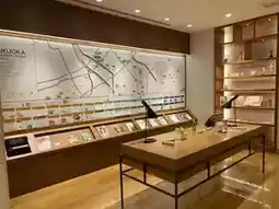 Items introducing the traditions and culture of Hakata, such as Hakata dolls and Yamakasa, are displayed on shelves with explanations.