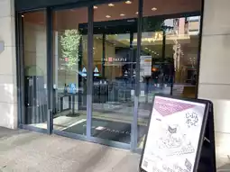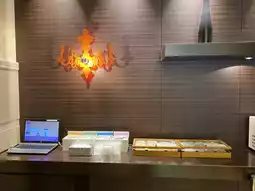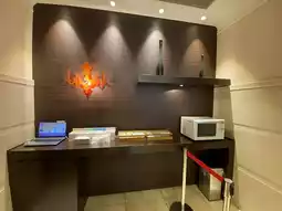 After arriving, I look around the front desk and entrance area.