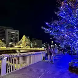 - Christmas sculptures are installed along the famous Nakasu food stall street. The trees are lit up with blue lights, the bridge is decorated with yellow decorations, and there is a large tree as the background, so it is great for taking pictures.