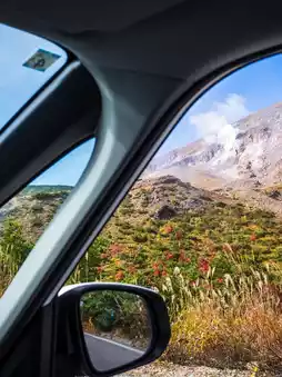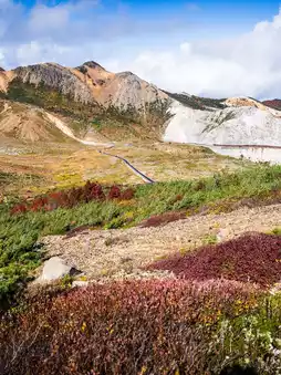 On the Bandai-Azuma Skyline, we drove through autumn forests until we saw white smoke rising from the slopes ahead—Azuma Naka-dake, one of the active volcanic craters in the Azuma Mountains. This approximately 29-kilometer mountain road, open only from spring to autumn, offers a glimpse of the earth's birth.