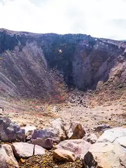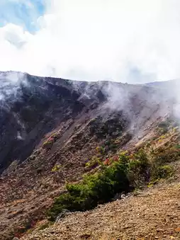 Below, a deep crater formed by an eruption over 7,000 years ago, its reddish-gray stone walls dotted with golden and red koyo bushes. The cool light reflected on the crater made it seem as if the mountain was reviving.