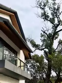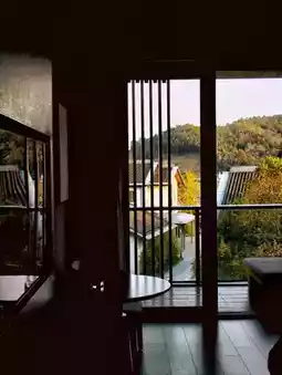 Soaking in the outdoor private hot spring, watching the distant mountains dyed with layers of colorful forests