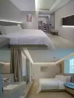 The hotel lobby is spacious and bright, decorated in a modern minimalist style. The rooms have good lighting, comfortable and tidy bedding, and bathrooms with separate wet and dry areas. Overall cleanliness is satisfactory, and public areas are regularly disinfected.