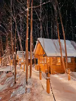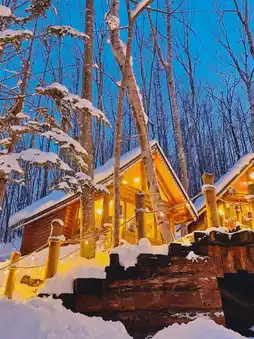At 4 o'clock in the evening, the cabin surrounded by the forest was lit up with warm lights, and the cabin under the white snow became a bit more mysterious. There are also Christmas trees 🎄 and snowmen ⛄️. If you are lucky, you can meet little foxes 🦊 and squirrels. It is really dreamy.