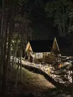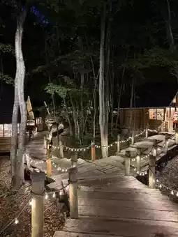 Small log cabins are scattered throughout the surrounding forest. Enveloped in the tranquility of the forest and its warm light, even a stroll is soothing.
