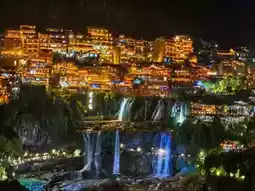 At night, the town lights up with golden hues contrasting against the blue illumination of the waterfall, creating a breathtaking scene. Visitors can enjoy local delicacies, stroll through the pedestrian streets, cross wooden bridges, and watch various performances. It's worth exploring both during the day and at night.