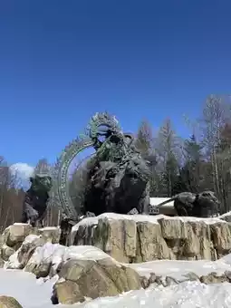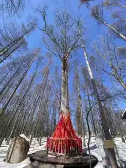 The Tree-God (that tall tree wrapped with red ribbons and God of Changbaishan (riding a tiger) are looking so mighty. The snowy path and are beautiful.