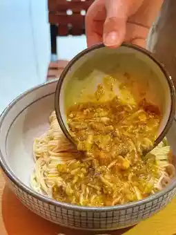 Gently mix the crab powder, the noodles are covered with crab powder, the entrance is refreshing, double freshness impacts the taste buds.