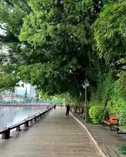 We then moved to West Lake Park, where we enjoyed a boat ride on the lake and admired the blooming peach blossoms along the willow embankment (best viewed from March to April). Taking photos under the white peach trees gave us an ethereal vibe, and finally, my bestie's Hanfu and round fan props came in handy. The giant banyan trees in the park provided natural shade as we lay on the grass and shared the Qing Jasmine (glutinous rice balls) we bought from Xianfeng Morning Market. They were sweet but not too rich.