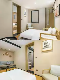 Each room is poetically named after flowers. The Wisteria King Room is cozy and comfortable, featuring natural wood and traditional window frames with lush greenery outside. Here, you can enjoy 24-hour butler service and participate in fascinating intangible cultural heritage activities like DIY lacquer fan making, experiencing the charm of traditional craftsmanship.