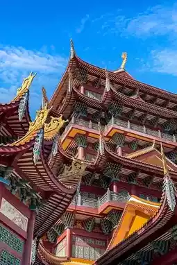 The Five Hundred Arhats Hall, built in 1993, is a five-story structure and the largest building in the temple complex. Xichan Temple is Fuzhou's most imperial-style ancient temple, not only due to its vast area but also because of its uniformly golden glazed tile roofs, which closely resemble those of the Forbidden City. The combination of red and yellow colors is unconventional yet exudes grandeur.