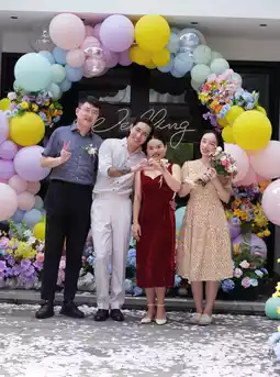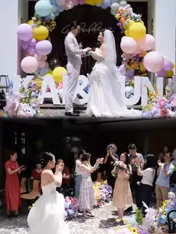 The traditional courtyard with blue bricks and gray tiles is adorned with colorful balloons,