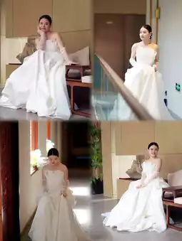 The bride looks graceful and elegant in her wedding dress,