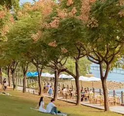 At noon, head straight to the riverside lawn for a picnic! Lay down a checkered mat with sandwiches and sparkling water, look up at the blue sky and white clouds, listen to the sound of the river waves, and the shade under the ancient banyan tree is perfect for cooling off. No gear? No problem! There’s a mobile coffee cart nearby where you can grab an iced Americano and sit on a bench watching boats pass by—so cozy you won’t want to leave.