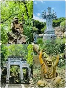 A group of Arhat statues hidden in the mountains, each expression vivid and lifelike! The sunlight filtering through the leaves creates stunning light and shadow effects