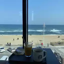 It's heaven when you drink coffee while looking at the ocean through the cool large windows.