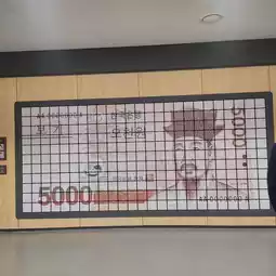 Take a picture while sitting on a bench made of pieces of 50,000 won banknotes.