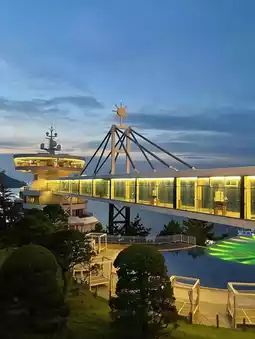 Atmosphere/Facilities: A cruise-shaped hotel with an ocean view.